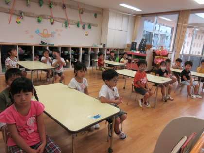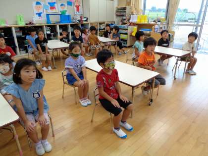今日から2学期が始まりました。始業式は感染症対策のため、放送で園長先生の話を聞きました。どのクラスも真剣に話を聞いていました。