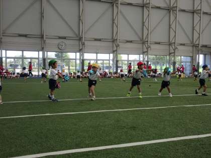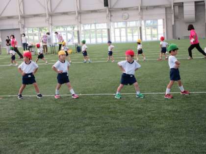 かまぼこドームで運動会予行練習をしました。初めての場所に登園時は緊張した表情の子供たちも、友達や先生の顔を見て安心できた様子でした。南公園で練習した経験もあり、のびのびと踊ったり走ったりしていましたよ。運動会当日もがんばる姿を保護者の方に見ていただけるように励ましていきたいと思います。