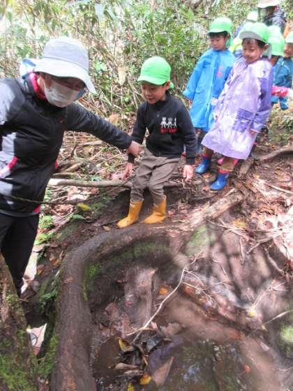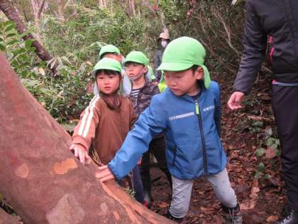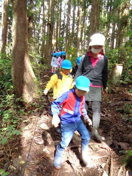 年長児は「トントンの森」の一番長いコースを散策しました。高い段差や急な坂道、ぬかるんだ地面など険しい道のりでしたが、自然の中を楽しみながらゴールまで無事に歩いてくることができました。