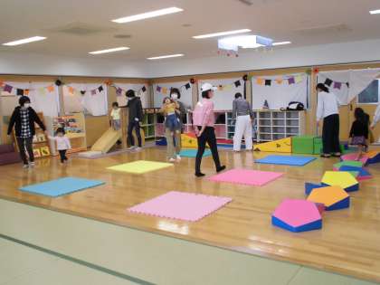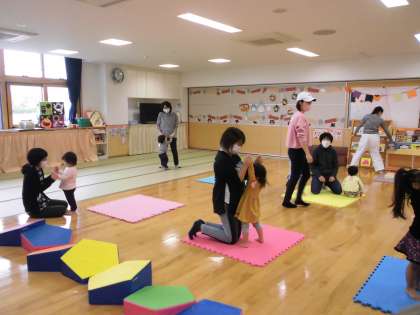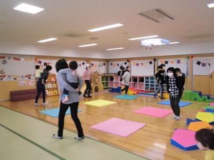 10月20日(水)いちごサークル:その2 公開日 2021/10/21 更新日 2021/10/21 子育て支援 次は、おんぶ歩きです。ママにおんぶしてもらいながら、自分でバランスをとる力、つかまる力等を養います。次に腕をもって少しづつ子供の体をもちあげ、ぶら下がる力のつけ方も教わりました。次は遊具を使ってサーキット遊びです。でこぼこ道を歩くとき、子供は自分の頭を使って体のバランスをとっているそうです。