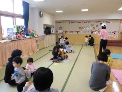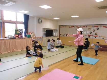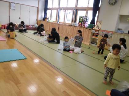 最後は、ビニール袋と色紙を使って指先の運動です。ママと色紙を引っ張り合いながらちぎることで、指先の力がついていきます。どんな活動や遊びをしていても「上手、ありがとう、という言葉を子供にたくさん掛けてあげましょう」と宮原先生がお話しされました。大切な言葉だなと感じ、園の子供たちにもたくさん伝えていきたいと感じました。