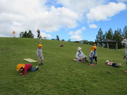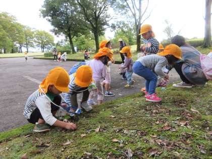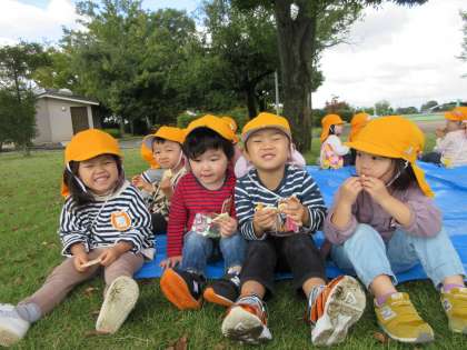 南公園で遠足ごっこを楽しんだみかん組の子どもたち。公園でおやつを食べ、ソリ滑りやドングリ拾いをして遊びました!
