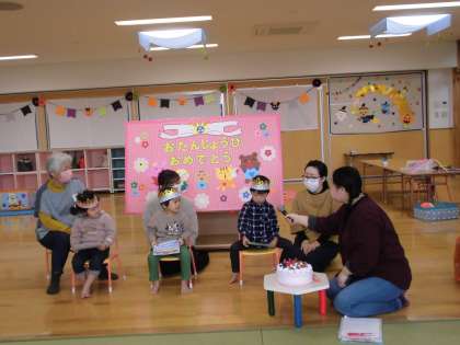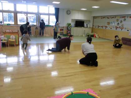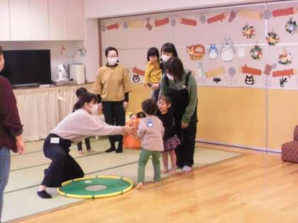 10月26日(火)メロンサークル:その2 公開日 2021/10/27 更新日 2021/10/27 子育て支援 ジャンケンを楽しんだ後は、9月と10月の誕生会をしました。そしてお楽しみ会に、みんなで「ピーカーブー」の体操とママと一緒に「カボチャ運びレース」をしました。ママと力を合わせてカボチャを運んだり、次に待っているお友達に「どうぞ」とカボチャを上手に渡したりすることができました。面白かったね!