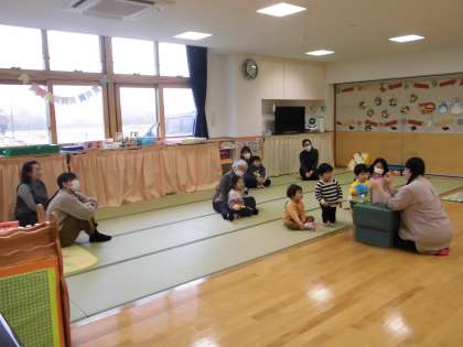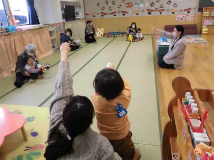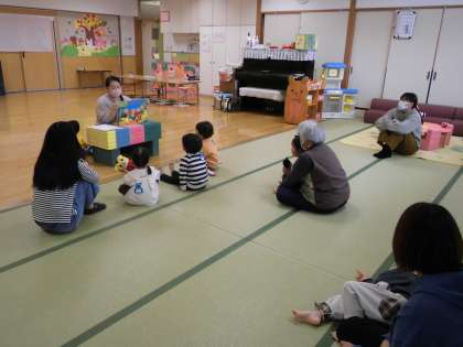 11月9日(火)メロンサークル:その1 公開日 2021/11/11 更新日 2021/11/11 子育て支援 今日は雨降りの寒い日でしたが、5組のお友達が集まってくれました。はじめは「焼きいもジャンケン」です。勝ったか負けたかが少しずつ分かってきているメロンサークルさんたちは、元気にジャンケンに参加していました。その後は「3びきのこぶた」の動く絵本を読んでもらいました。しっかりお話が聞けるようになってきましたね!