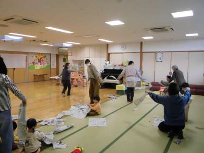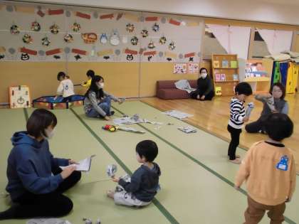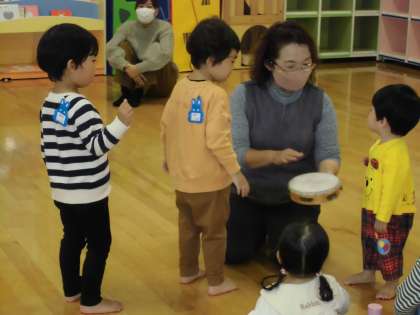 11月9日(火)メロンサークル:その2 公開日 2021/11/11 更新日 2021/11/11 子育て支援 後半は、塩原先生を講師にお招きして「親子リトミック」を楽しみました。新聞紙を使ってトンボに変身したり、ドングリやソフトクリームを作ったりして見立て遊びを楽しみました。またタンバリンやおりんを使ってリズム遊びもしました。ママやおばあちゃんと一緒にとても楽しい時間を過ごしました。