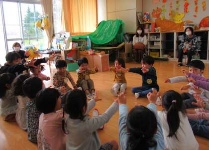 集団遊びは、じゃんけん列車や花いちもんめ、だるまさんがころんだ、フルーツバスケットなど、日ごろから楽しんでいる遊びを楽しみました。