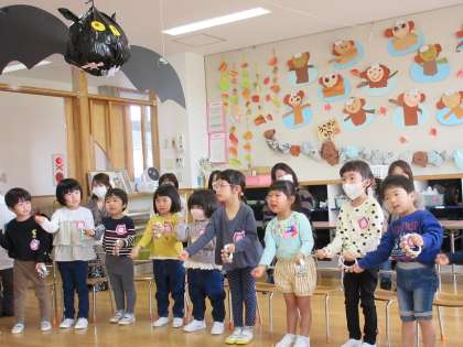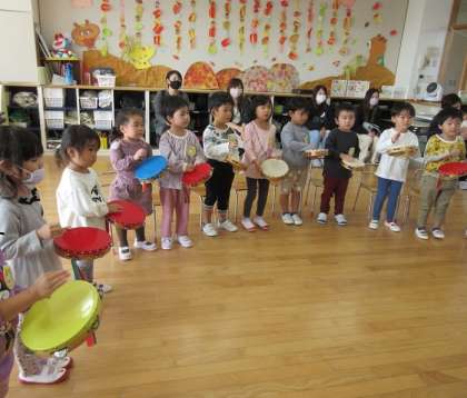 楽器は、休みの時は音を出さないことや大事に扱う約束をしてから取り組むと「ばなな」の言葉に合わせてリズムを出すことができました。生活発表会に向けて、いろいろいろなリズムを楽しんでいきたいと思います。