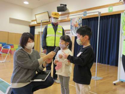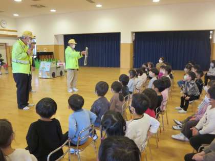 交通安全冬の集い 公開日 2021/12/21 更新日 2021/12/21 年中もも・すみれ組 今日は地域の方がこども園に来て、交通安全について教えてくださる交通安全冬の集いがありました。子供たちは「道路を渡るときは走らない」「右左右をよく見る」「手を挙げて渡る」等の交通安全のお約束を教えてもらった後、実際に横断歩道を歩く練習をしました。 また、一人ひとりが書いた交通安全のお約束を書いた飾りをツリーに飾り「交通安全を守ります!」と約束しました。