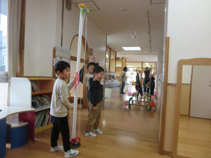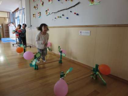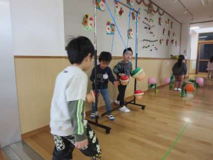 マリオワールドでは海の中のアイテムをジャンプしながらゲットする・動くこうらをよける・パックンフラワーをジャンプする・くりぼーをタッチする・ゴールの旗をあげる遊びがあります。こうらを動かしてあてる係や旗を戻す係もあり、子供たちがいろいろなコーナーで関わりながら遊んでいます。落ちないように、あたらないように…ハラハラドキドキが楽しくて、体を動かすことが大好きなすみれ組は大盛り上がりです。