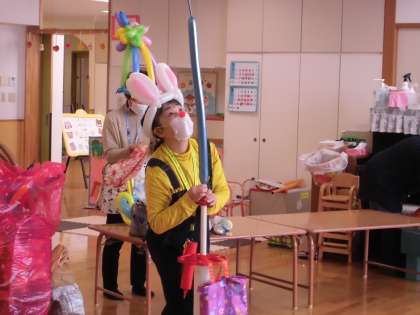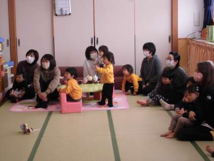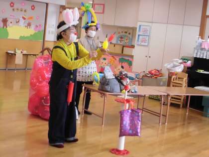 今日は、先週に引き続き合同で親子サークルを行いました。講師に和泉先生と吉野先生をお招きして、バルーンアートを見せていただきました。風船に空気を入れる様子を見て「うわー!」と親子で驚きの声を上げていました。