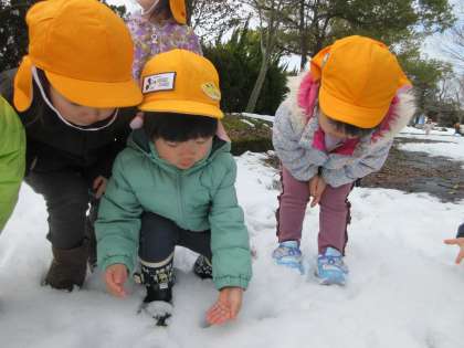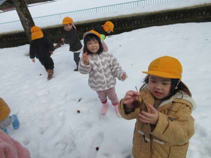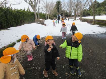 南公園へ散歩に行きました!まだ雪が残る並木道、ひさしぶりのお散歩に大喜びの子供たち。犬や鳥の足跡を発見したり、木の実を見つけたりしました。雪の上を一歩一歩楽しんで歩きましたよ。