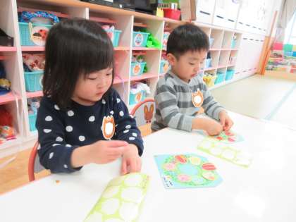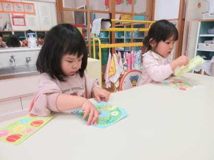 月刊誌「できた」2月号のシール遊びを楽しみました。お花のシールを貼って、フラワーブーケとフラワーリースの完成!どこに貼ろうかなと悩みながらも楽しそうな子供たちでした。