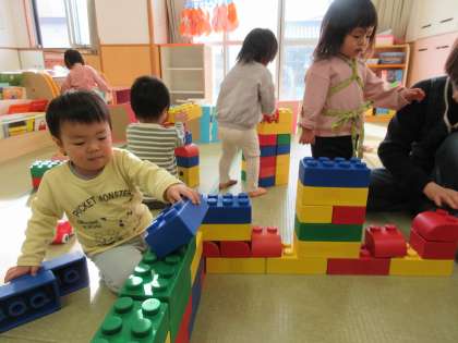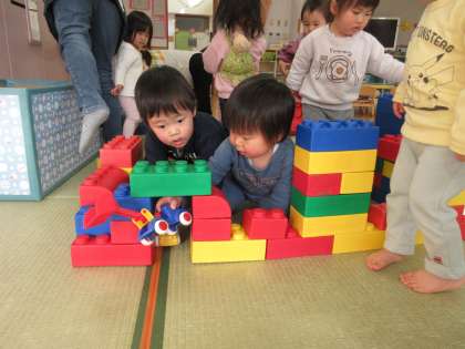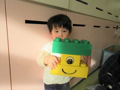 大きなレゴブロックで遊んだよ! 公開日 2022/03/11 更新日 2022/03/11 0歳児いちご・1歳児りんご組 普段から小さいレゴブロックで遊んでいる子供たち。大型レゴブロックを出すと「大きい!」と大喜び。高く積み上げたり、お家をつくろうと自分の周りを囲ったり、おばけの顔をつくったり・・・いろいろな遊び方をしていました。お片付けも箱の中に一生懸命詰めて、上手に出来ました。またいろいろな物をつくったり組み合わせたりして遊んでいきたいと思います。