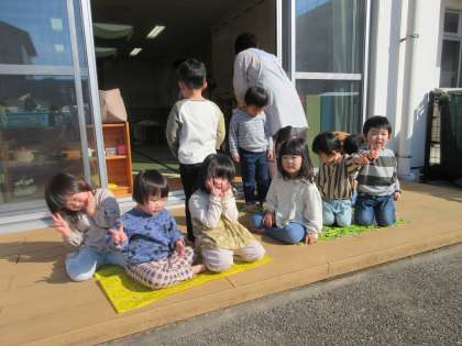 テラスにレジャーシートを敷いて、みんなで日向ぼっこをしました。「暖かいね」「楽しい」と子供たち。とても素敵な笑顔を見せてくれましたよ。