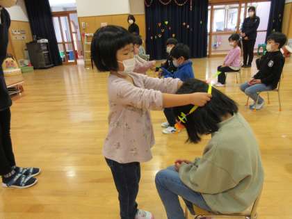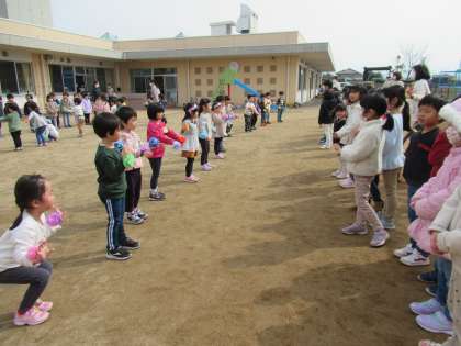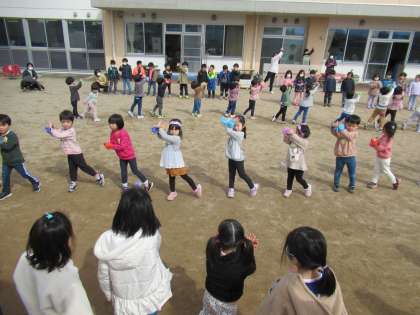 年長さんありがとうウィーク2 公開日 2022/03/15 更新日 2022/03/15 園行事 年少組は画用紙で作ったお花の首飾りのプレゼントを一人一人首にかけてあげました。また、園庭で「ツバメ」の踊りを披露しました。かわいらしい年少さんの踊りを見ながら年長さんも一緒に踊って楽しみました。