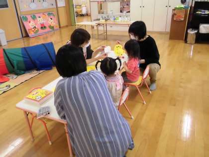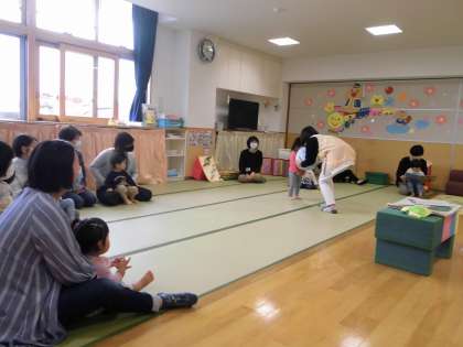 令和4年度初めての親子サークルを行いました。好きな遊びをした後は、集まりの会で手遊びをしたり、大型絵本を見たりしました。今年度、みんなで楽しく遊びましょうね。