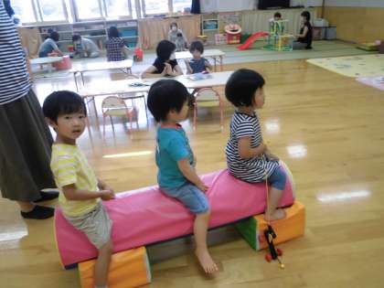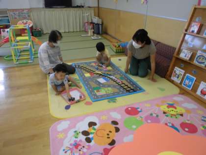 今日の親子サークルは6月の誕生会を行いました。みんなで歌を歌ったり、ケーキの出てくるパネルシアターを見たりしてお祝いをしました。その後は、友達と一緒に積み木に乗ってバスごっこをして遊んだり、ままごとでピザやケーキをお皿に乗せて食べたり、好きな遊びを楽しんでいました。