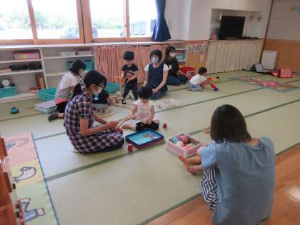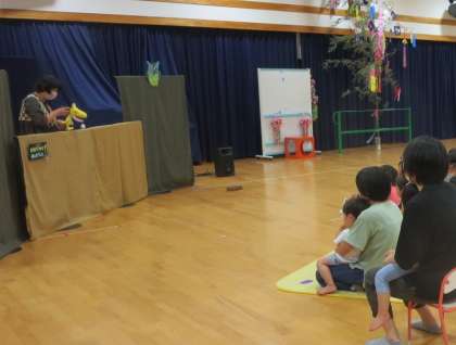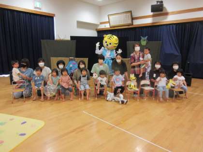 今日の親子サークルは劇団ショコラさんの人形劇「もういいかい?まぁだだよ〜ともだちや〜」を観劇しました。キツネやオオカミなどの動物がたくさん出てきて、嬉しそうに見ていました。最後には、大きな着ぐるみの人形“こころちゃん”から風船でつくるお花のプレゼントもあり、記念写真も撮らせていただきました。