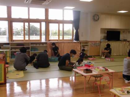 今日の親子サークルは、ハロウィンのリースづくりをしました。折り紙でつくったかぼちゃや猫に模様をつけてリースに貼ったり、シールで飾り付けをしたりして、可愛いリースが出来上がりました。また、お部屋では、鉄棒にぶら下がったり、トンネルをくぐったりして体を動かして遊びました。