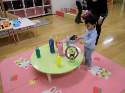 今日の親子サークルは、10月の誕生会を行いました。10月生まれのお友達おめでとうございます!その後はハロウィンのゲーム遊びをしました。かぼちゃの模様がピンになっているボーリングや、輪投げ、釣り等のコーナーでお家の方と一緒に遊びました。可愛いお化けやかぼちゃのお面も似合っていましたね。