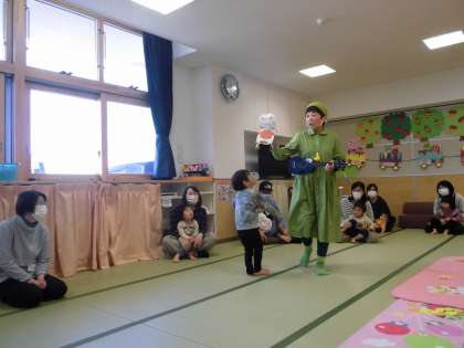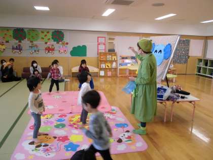 今日の親子サークルは、講師にゆきみだいふくさんをお招きして「ゆきみだいふくと遊ぼう」で楽しみました。ギターやウクレレの音楽に合わせて歌ったり、ゆきみだいふくさんがつくられた「月夜のばんに」という曲に合わせて、ウサギやタヌキになったりして楽しく踊りました。
