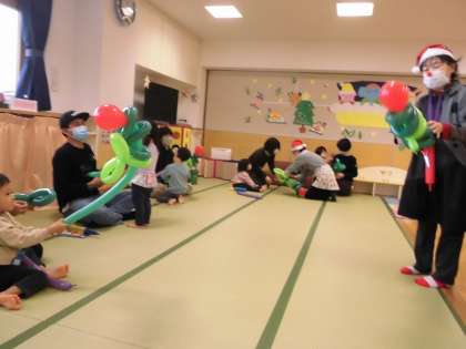 カラフルなバルーンを見て、さっそく「楽しそう」「風船大好き」という声が聞かれました。もうすぐクリスマスということで、サンタさんやリースのバルーンをつくっているところを見せていただいたり、講師の先生に作り方を教えてもらいながら、親子ではらぺこあおむしを作ったりして、楽しい時間を過ごしました。