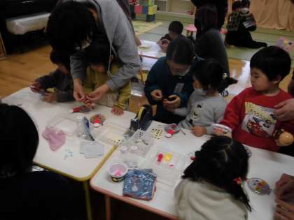 可愛い表情のサンタさんや、シールがたくさん貼ってある物など、いろいろな模様のスノードームが完成しました。スノードームの模様がキラキラと動く様子に「きれいだねー」と喜んでいるお友達もいました。