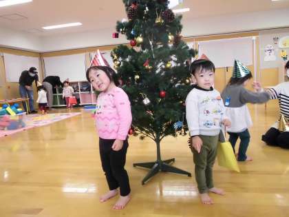 今日の親子サークルは、クリスマス会をしました。初めにブラックパネルシアターをすると「キラキラだね」と、光る動物の様子等を嬉しそうに見ていたお友達がたくさんいました。その後は「まってますクリスマス」の曲に合わせて踊り、最後にはクリスマスのプレゼントをもらいツリーの前で記念写真をとりました。
