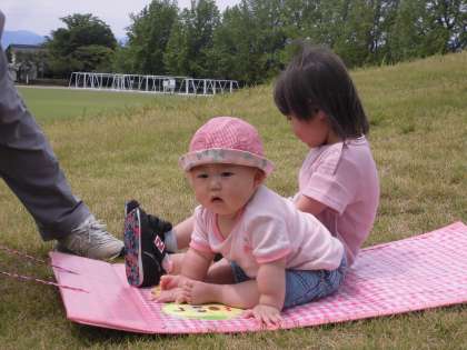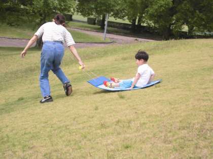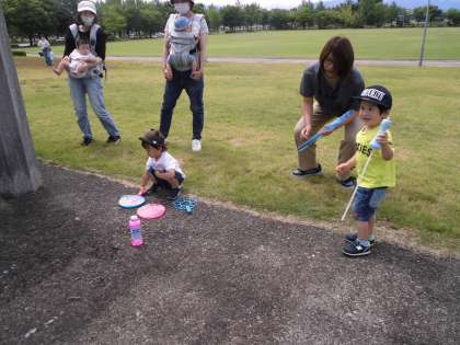 今日の親子サークルは、南公園で遊びました。シャボン玉遊びではいろいろな形のシャボン玉ができて嬉しそうな表情が見られました。また、芝生の上でのそり遊びも人気で、何度も繰り返し楽しんでいました。