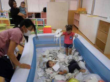 今日の親子サークルでは、新聞プールや、ボールプールで遊びました。新聞をビリビリと破いて水のようにして、プールの中を泳ぐ真似をしたり、お友達にかけたりしてたくさん遊びました。魚釣りの遊びも人気でした。来週もまた楽しく遊びましょうね。