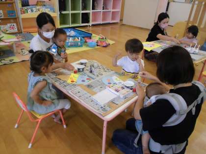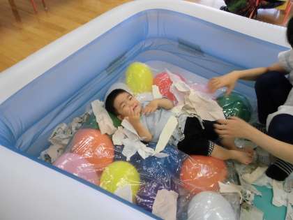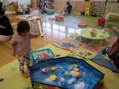 毎日暑い日が続いていますが、親子サークルには元気なお友達がたくさん遊びに来てくれました。先週から楽しんでいた新聞プールや魚釣りを楽しんだり、風船ベットの上で寝転んだりしてたくさん遊びました。集まりでくまのかき氷やさんのペープサートを見た後は、みんなでかき氷やアイスクリームのスタンプ遊びをしました。アイスクリームにスタンプでトッピングをしたり、かき氷のシロップに見立てた絵の具で色付けをしたりして、おいしそうなアイスクリームやかき氷が完成しました。