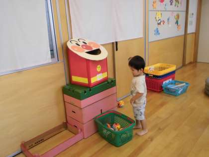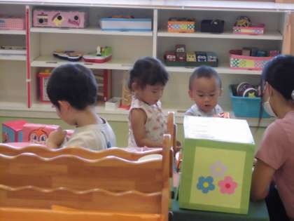 今日の親子サークルは、室内で遊びました。アンパンマンの口をめがけてボール投げをしたり、魚釣りをしたりして遊びました。親子サークルはこれでしばらくお休みになり、次回は9月5日(火)になります。「ゆきみだいふくさん」と楽しく遊ぶ予定です。暑い日が続きますが、元気に過ごしてくださいね。9月に会えるのを楽しみにしています。