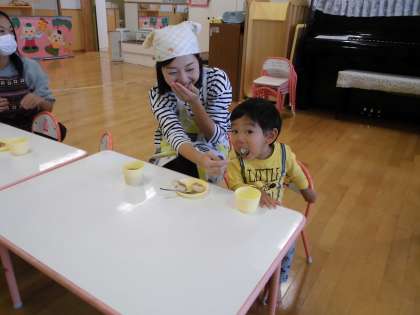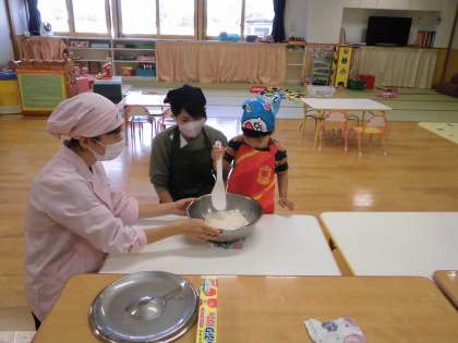今日の親子サークルは富山市役所から栄養士の方をお招きして、離乳食の進め方や、手づくりおやつレシピの紹介をしていただきました。離乳食から幼児食への移行のポイントや、おやつのポイントなど、資料を見ながら分かりやすく教えていただき、お家の方も興味深く聞いておられました。その後は、五平もちのクッキングをしました。ご飯に胡麻を混ぜて、好きな形に整えてホットプレートで焼くと香ばしいにおいがしてきて「おいしそう」と子ども達もワクワクしている様子でした。出来上がった五平もちをおいしそうに食べていました。