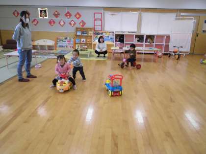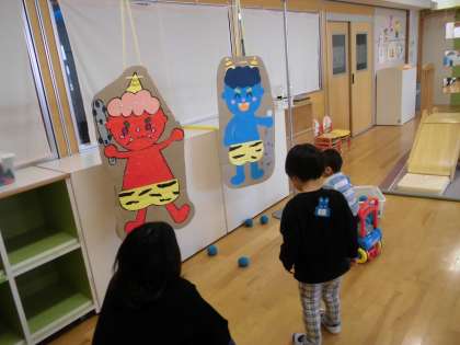 今日の親子サークルでは、先週に続き段ボールの鬼に玉を投げて豆まきを楽しみました。また、風邪が流行しやすい時期なので、手洗い、うがいをしようというペープサートを見ました。ペープサートを見ながら、手をゴシゴシとして洗ったり、うがいをする真似をしたりしていました。来週も楽しく遊びましょうね。