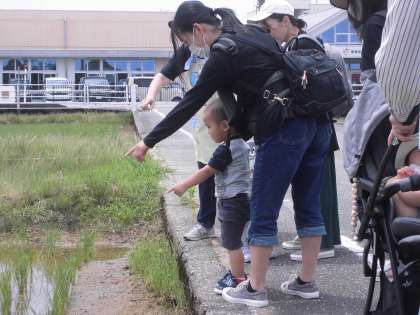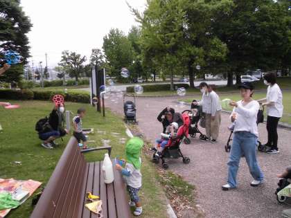 今回の親子サークルは南公園まで散歩に行ってきました。公園までの道のりでは、オタマジャクシを見つけたり、公園ではシャボン玉をしたりして楽しく過ごしました。