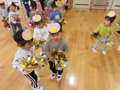 4月16日(木)お遊戯室へ遊びに行きました。年長組のお兄ちゃん、お姉ちゃんたちからプレゼントしてもらったはなかっぱのお面をつけて、みんなニコニコ♪両手にキラキラのポンポンを持って、音楽に合わせて元気いっぱいにダンスをしました。踊ったあとは、滑り台や積み木で遊びました。思いっきり体を動かして、楽しく過ごしました!