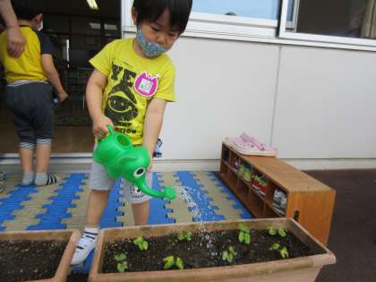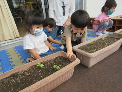 ベランダに出ると、プランターに植えた朝顔の芽を見付けて喜ぶ子供たち!芽をじっと見たり、水やりをしたりしました。大きく育ったらどんな花が咲くかな?