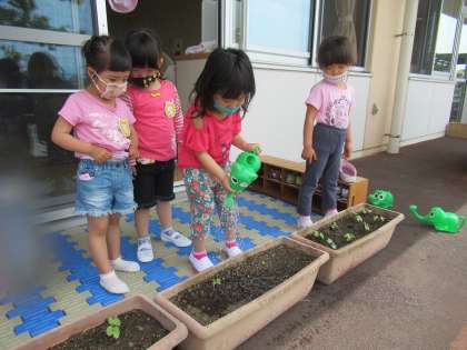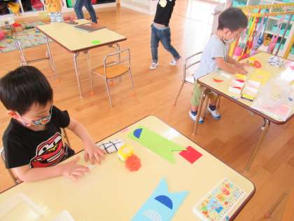 今日はきりん組の登園日でした。お部屋や遊戯室で元気いっぱい遊んだり、こいのぼりをつくったりしました。アサガオの葉っぱを見た子供たちは「木くらい大きくなるかな?」とこれからの生長を楽しみにしているようでした。