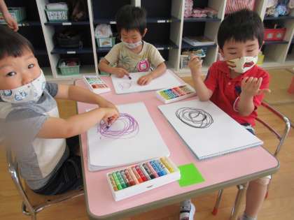 今日は待ちに待った、お絵かきをしました。ピカピカのクレヨンに自由画帳!クレヨンや自由画帳の使い方を一緒に確認し、好きな色を選んで描く子供たち!