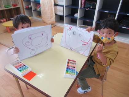 クレヨンの滑りを確認するようにぐるぐると描いたり、好きなキャラクターを描いたりして思い思いに楽しんでいました!これからいっぱい絵を描いて遊ぼうね☆