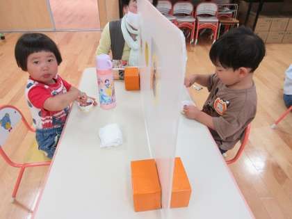 今日は登園日。久しぶりに顔を合わせる子供たちは、友達の名前を呼んでとても嬉しそうでした。コロナウイルス対策のため、自分のマークのついた衝立の前でおやつを食べました。「冷たーい」「おいしい」とおやつのゼリーをにこにこで食べていましたよ。