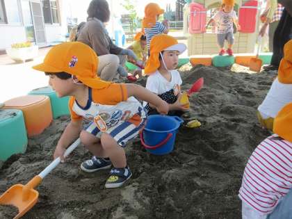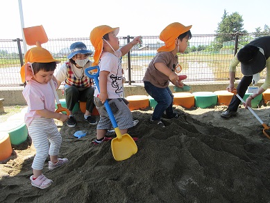 とてもお天気が良く、園庭の砂場で遊びました。穴堀りをしたり、スコップで砂山をつくったり、山を登ったり…思い思いの遊びを先生や友達と一緒に楽しみました♪