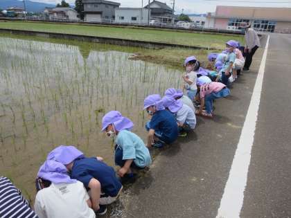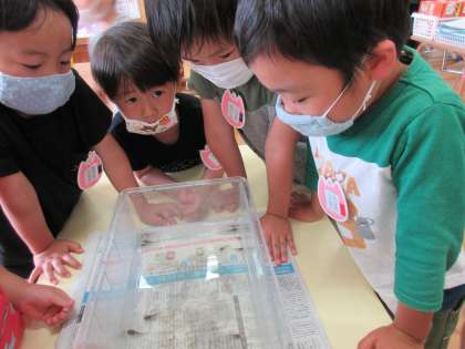 今日は、先日話をしていたオタマジャクシを探しに散歩に行ってきました。田んぼへ行くと「先生、ここにオタマジャクシいるよ」「小さい虫もいる」などと話をしながら探したり、田んぼの中を観察したりしました。部屋に戻ってからは、よく見える観察ケースに入れ、順番に見ていました。「エサは何を食べるのかな」という子の声に「鰹節だよ」「ご飯粒も食べるよ」と、教えてくれる姿も見られました。図鑑を見たり、お家の方に聞いたりしながらお世話をしていきたいと思います。