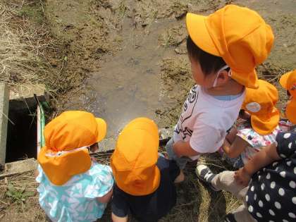 南公園までお散歩に行きました。途中の田んぼでオタマジャクシがたくさん泳いでいるのを見つけると、大喜び。オタマジャクシをつかまえて観察ケースに入れると、泳ぐ姿に興味津々の様子で見ていました。クラスでもまた観察したいと思います。