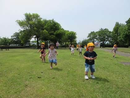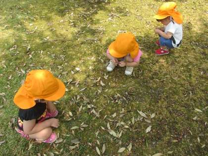 南公園では「よーいどん」と保育士のいるところまでかけっこ。にこにこで走る姿はとても気持ちよさそうでした。ドングリがたくさん落ちていて「あったよ」とポケットに集めたり「お豆が出てきた」とドングリの皮をむいてみたりして楽しみました♪