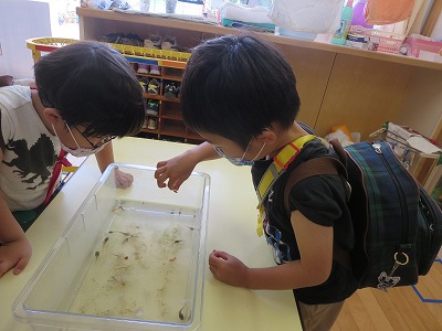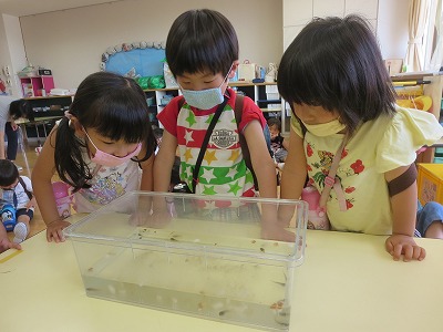 子供たちは、お家の方に「オタマジャクシは何を食べるのか」を聞いて、みんなに教えてくれました。「鰹節」「ご飯粒」の他に「パン」「小さい虫」などを食べることを知り、実際に「鰹節」「ご飯粒」「パン」をエサにあげてみました。「先生、鰹節なくなってるよ」「食べたんだね」「パンにくっついて食べてる」と、毎日オタマジャクシの様子を観察して成長を楽しみにしています。