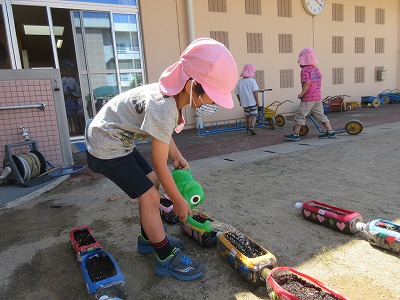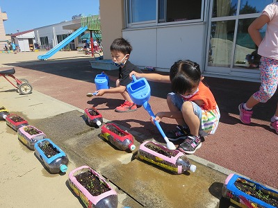 登園後、所持品の始末が終わると子供たちは、先日植えた黄花コスモスとヒマワリの水やりをしています。今日、水やりをしようとすると小さい芽が出ていることに気が付き「先生見て見て、黄花コスモスの芽が出てる」「青い種がくっついているのはヒマワリじゃない」と、子供たちで観察をしながら水やりをしました。「明日はもっと大きくなっているかな?」と生長を楽しみにしています。