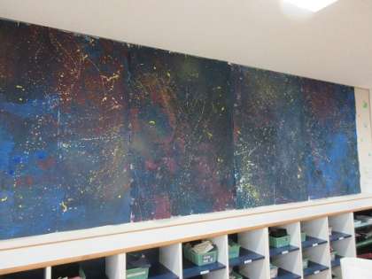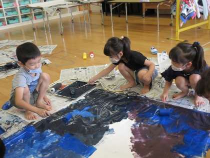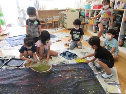 宇宙をつくろう 2(6/11) 公開日 2020/06/11 更新日 2020/06/11 年長ほし・にじ組 「宇宙って暗そう、お部屋の壁を暗くしたい!」「青と紫と黒を混ぜて色を塗ったらいいんじゃない?」子供たちで話し合い、部屋の壁面を宇宙にすることにしました。 ローラーで絵の具を塗ったり、筆で絵の具をとばして星を表現したりして、素敵な宇宙の完成!部屋に飾ると、「わ〜星がきれい!本当の宇宙みたい」と嬉しそうな子供たちでした。