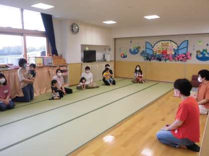 今日、ついに第1回親子サークルが始まりました。1・2歳児合同で11組のお友達が集まり、久しぶりに親子でたっぷり遊べたのではないでしょうか。久しぶりに会ったお友達とのおしゃべりも楽しそうでしたね。園長先生からのお話も上手に聞けましたよ。