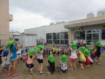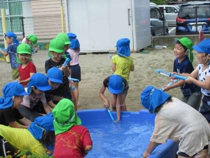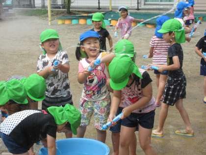 水遊びをしました(7/1) 公開日 2020/07/01 更新日 2020/07/01 年長ほし・にじ組 今日は今年初めての水遊びをしました。一人一本、自分の水鉄砲を持って飛ばし合いっこをしたり、的を狙ったりして遊びました。最後には、みんなで輪になって、3、2、1、発射!大きな噴水ができました。